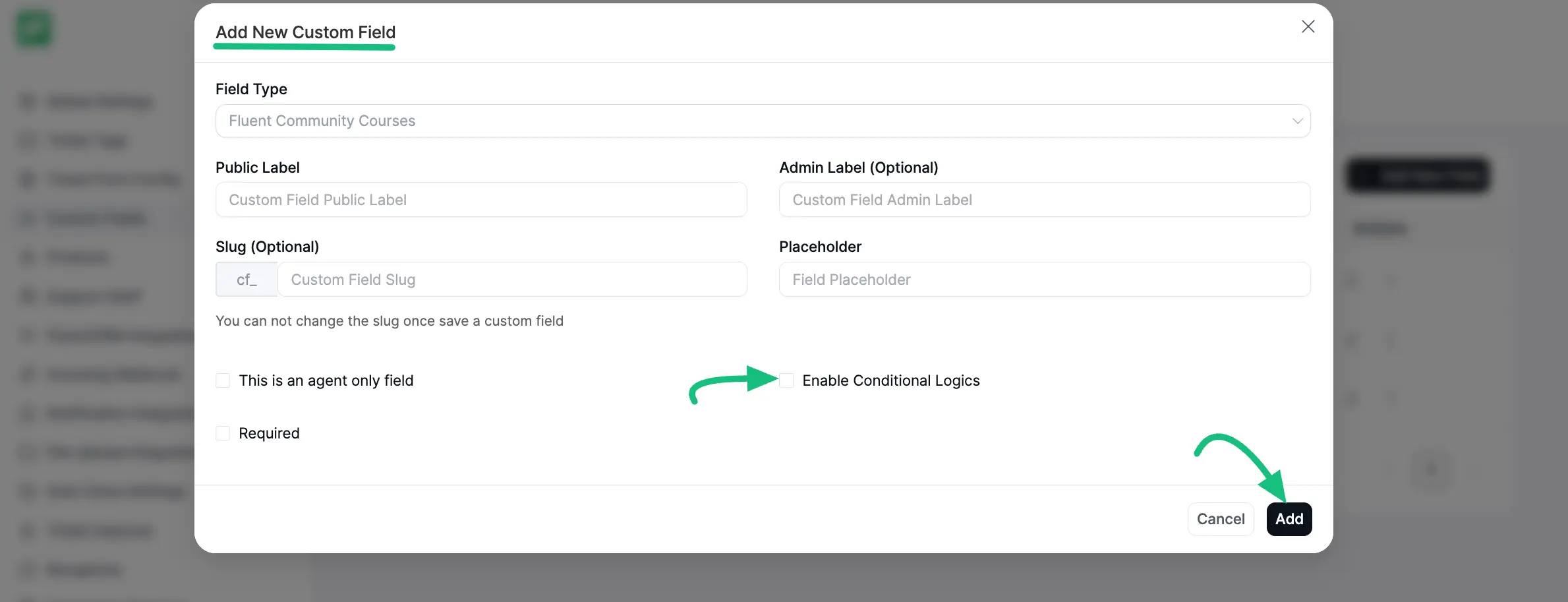 - Slug (optional): This is the unique identifier for the custom field. It’s auto-prefixed with cf_, and once saved, it cannot be changed.