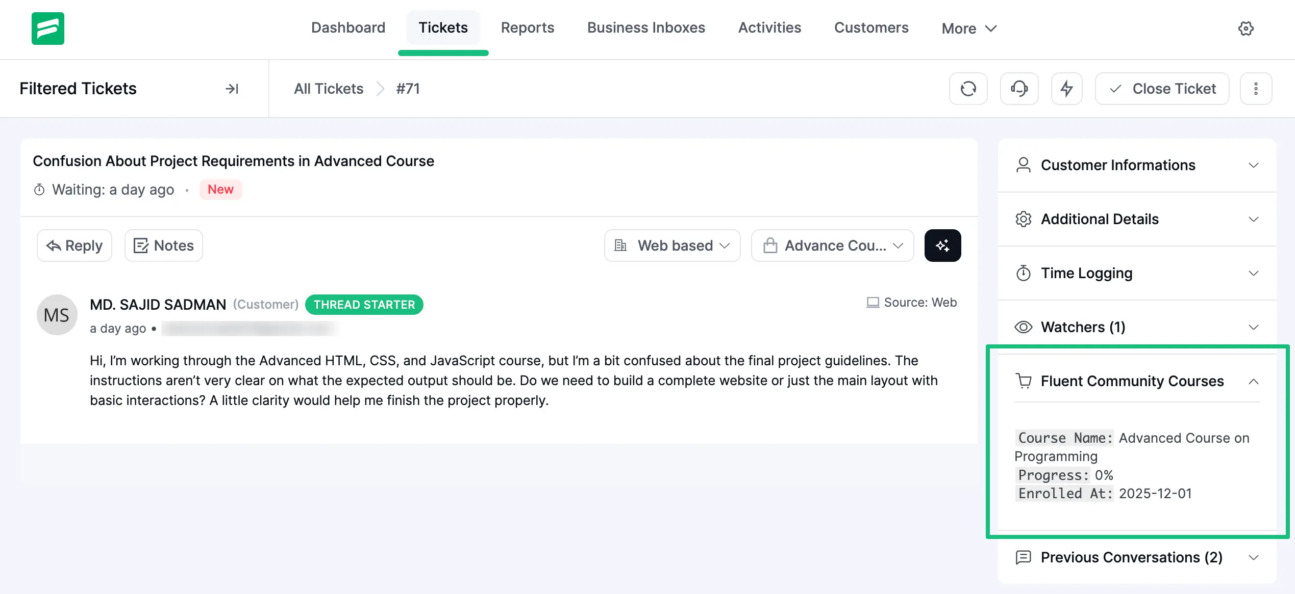 Once integrated, a dedicated “Fluent Community Courses” widget will be visible to agents within the individual support ticket view.