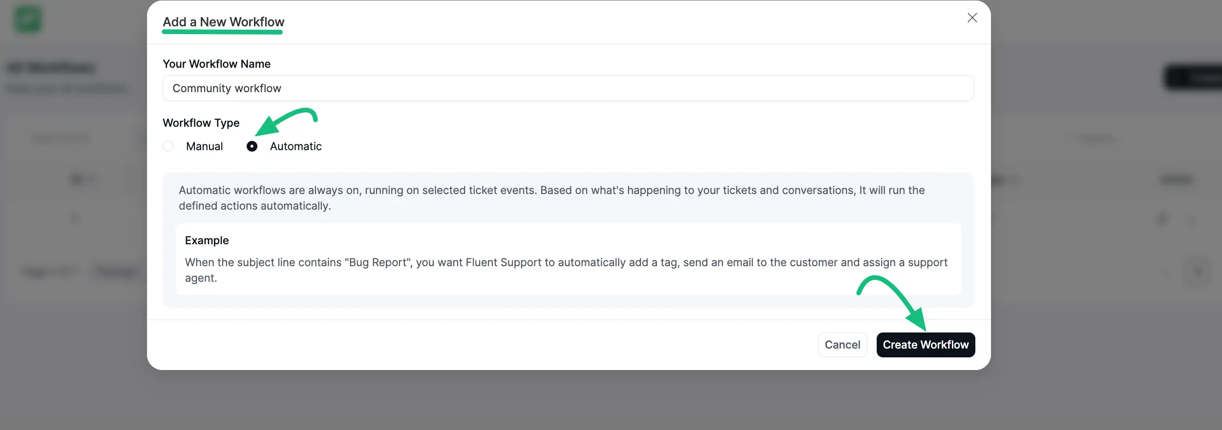 In the pop-up, provide a Workflow Name. Select Automatic as the Workflow Type. Next, click the Create Workflows button.